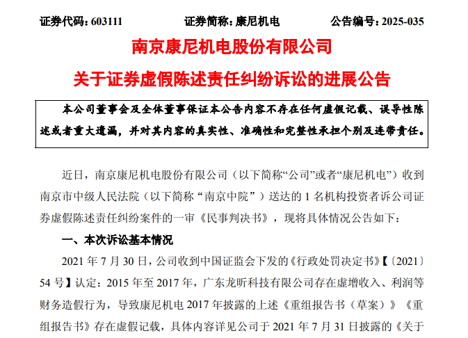 康尼机电7月28日公告,南京中院对1名机构投资者诉公司证券虚假陈述责任纠纷作出一审判决,公司被判赔偿损失并承担案件受理费合计约3309.31万元。